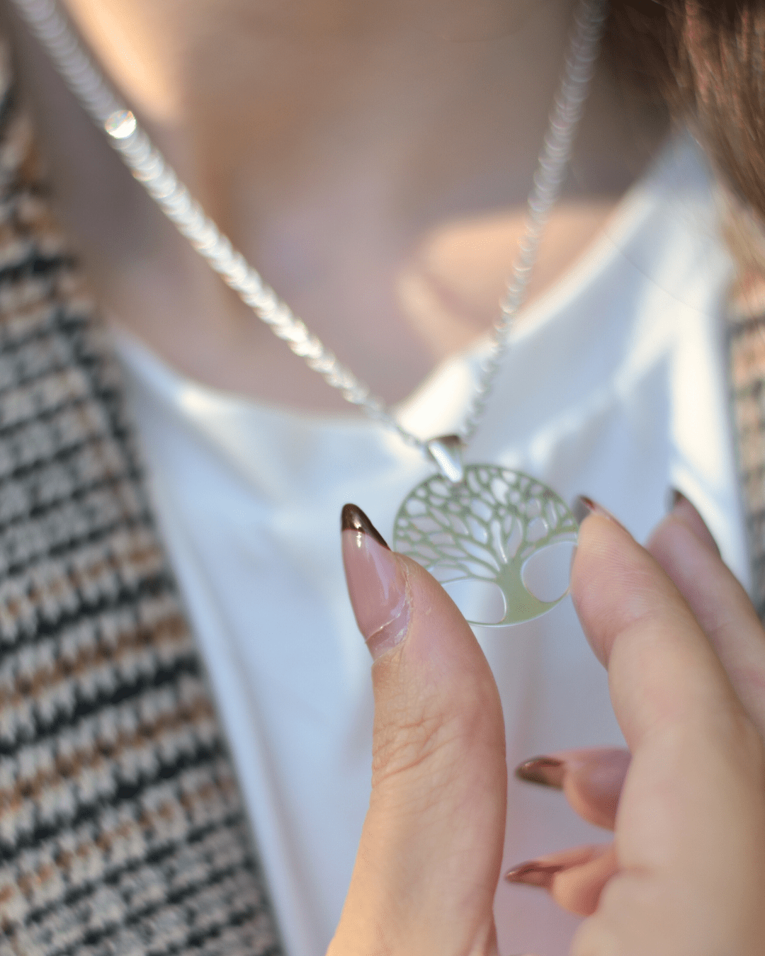 El colgante Druo presenta un elegante diseño del Árbol de la Vida, grabado con líneas suaves y limpias sobre una medalla de Plata de Ley 925. Sus ramas estilizadas evocan crecimiento, armonía y conexión, convirtiéndolo en una joya con un significado profundo y universal.