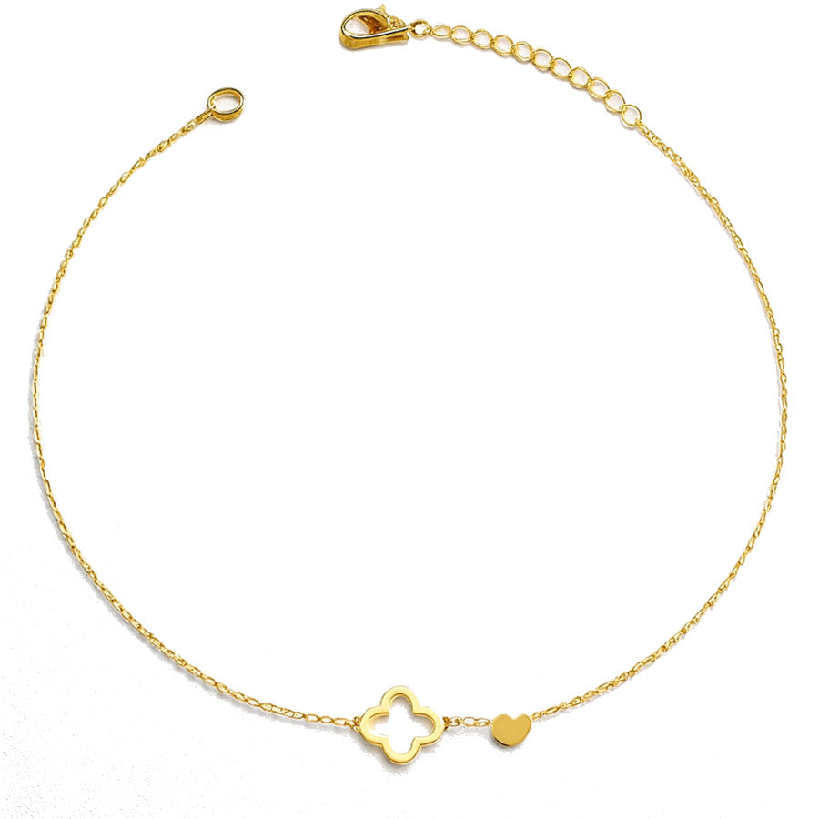 Gargantilla elaborada en acero chapado en oro con un delicado diseño que combina una flor calada y un pequeño corazón liso, creando una pieza elegante y llena de encanto. La forma suave de la flor aporta un toque femenino y armonioso que destaca sobre la cadena fina.