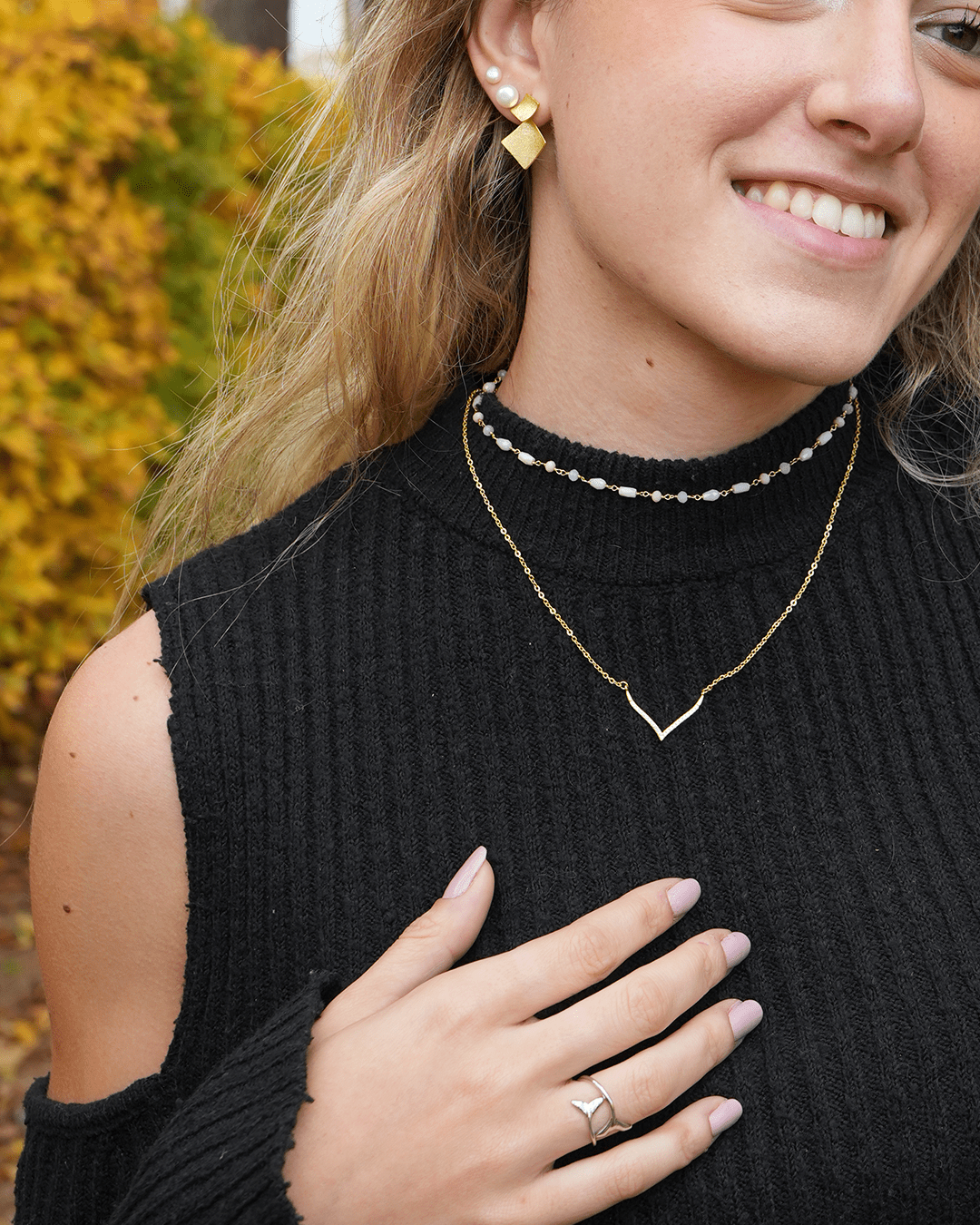 La gargantilla Emaztegaia combina elegancia y minimalismo en una joya versátil y sofisticada. Fabricada en Plata de Ley chapada en oro, su delicada barra en forma de V adornada con circonitas aporta un brillo sutil que realza el escote con estilo y feminidad.