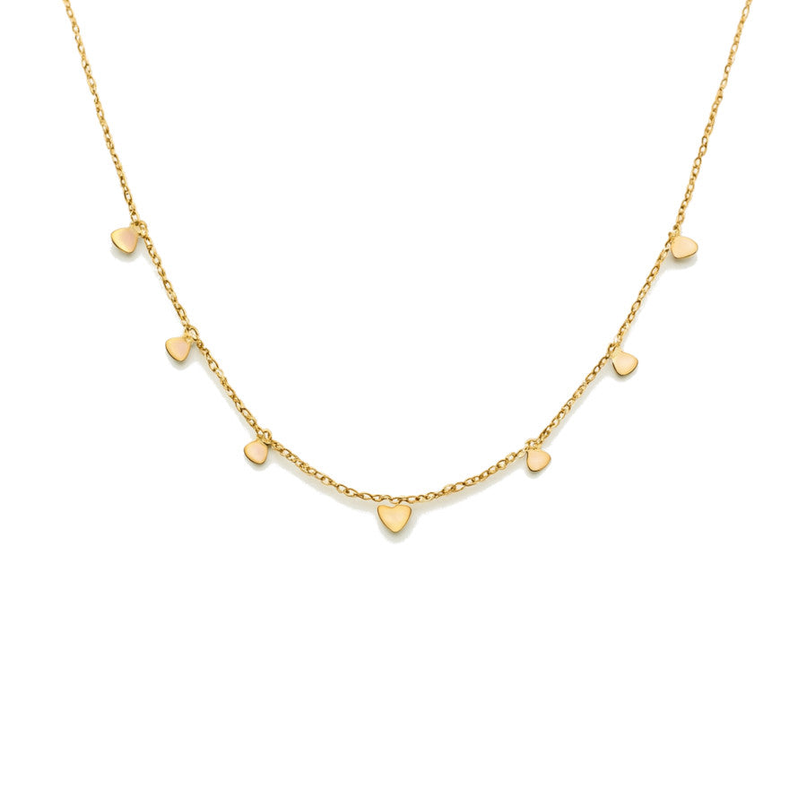 Gargantilla elaborada en acero chapado en oro con un delicado diseño formado por siete pequeños corazones colgantes distribuidos a lo largo de la cadena. Cada corazón aporta movimiento y un brillo suave que realza la elegancia de la pieza.