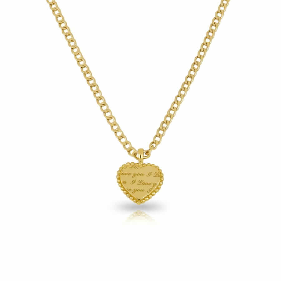 Gargantilla elaborada en Plata de Ley bañada en oro, compuesta por una elegante cadena barbada que aporta presencia y carácter sin perder sofisticación. En el centro, un colgante en forma de corazón con delicado relieve de pequeñas bolitas en el borde y un grabado repetido “I love you”, que convierte la pieza en un mensaje claro y emocional.