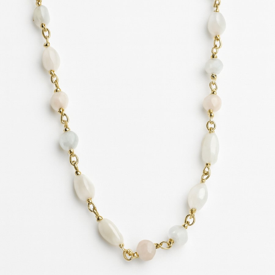Gargantilla de Plata de Ley chapada en oro con un diseño delicado formado por pequeñas piedras naturales en tonos rosáceos y neutros. Cada piedra está unida mediante eslabones dorados que aportan un acabado cálido, elegante y muy favorecedor. Perfecta para quienes buscan una pieza ligera, versátil y con un toque bohemio chic. Ideal para llevar sola o acompañada de otras gargantillas finas.