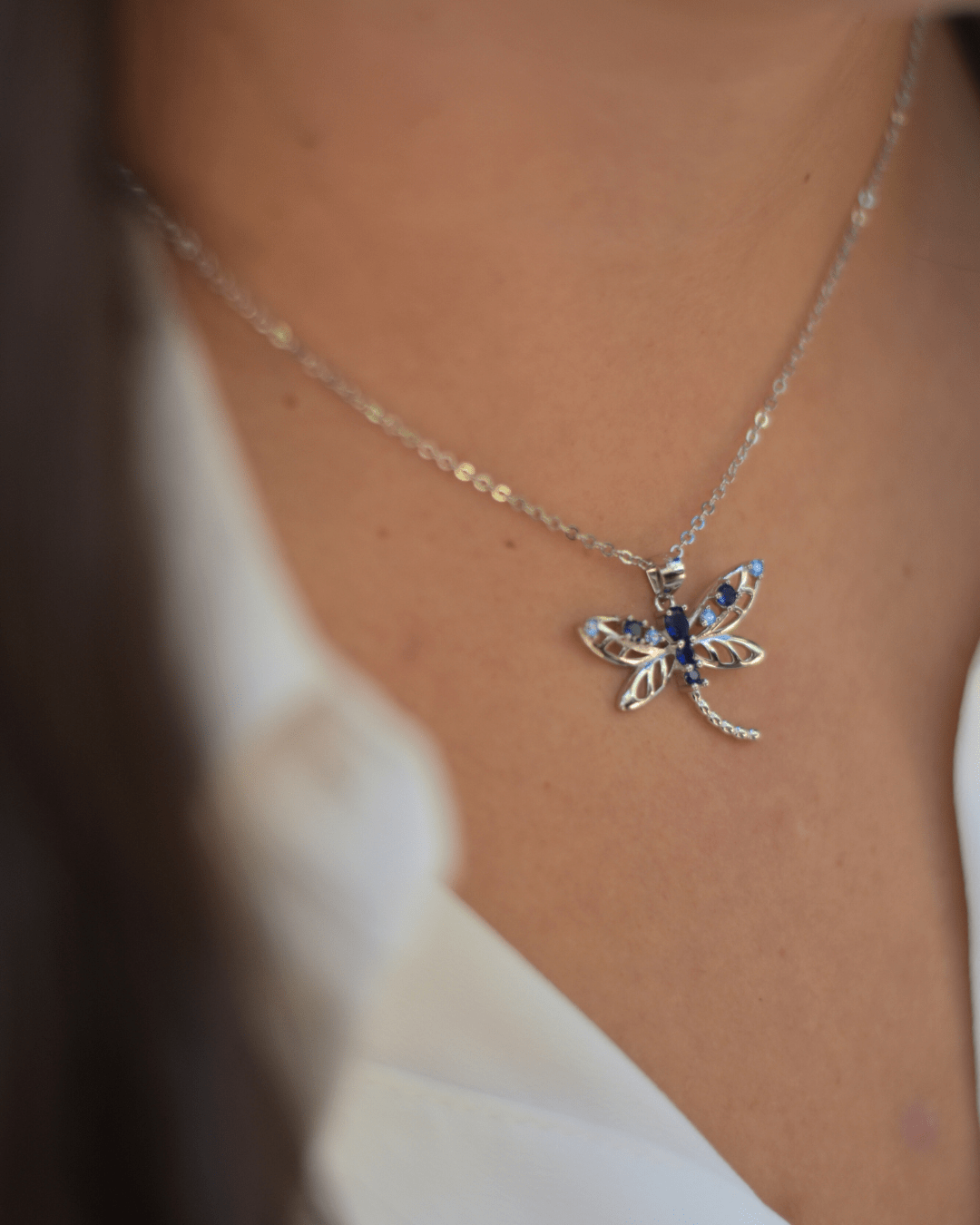 La gargantilla Lípalomo es una pieza que captura la esencia de la naturaleza. La libélula, símbolo de transformación y libertad, se adorna con delicadas circonitas en tonos azules, creando un contraste fascinante que refleja elegancia y serenidad. Perfecta para quienes desean un toque único y lleno de significado.