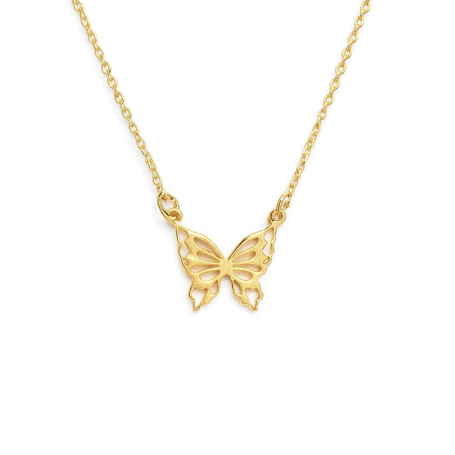 Gargantilla de Plata de Ley bañada en oro con delicado colgante en forma de mariposa calada. Su diseño ligero y estilizado simboliza libertad, transformación y movimiento, convirtiéndola en una joya con significado propio. El acabado dorado aporta un brillo cálido y elegante, perfecto para iluminar cualquier look, tanto en el día a día como en ocasiones especiales.