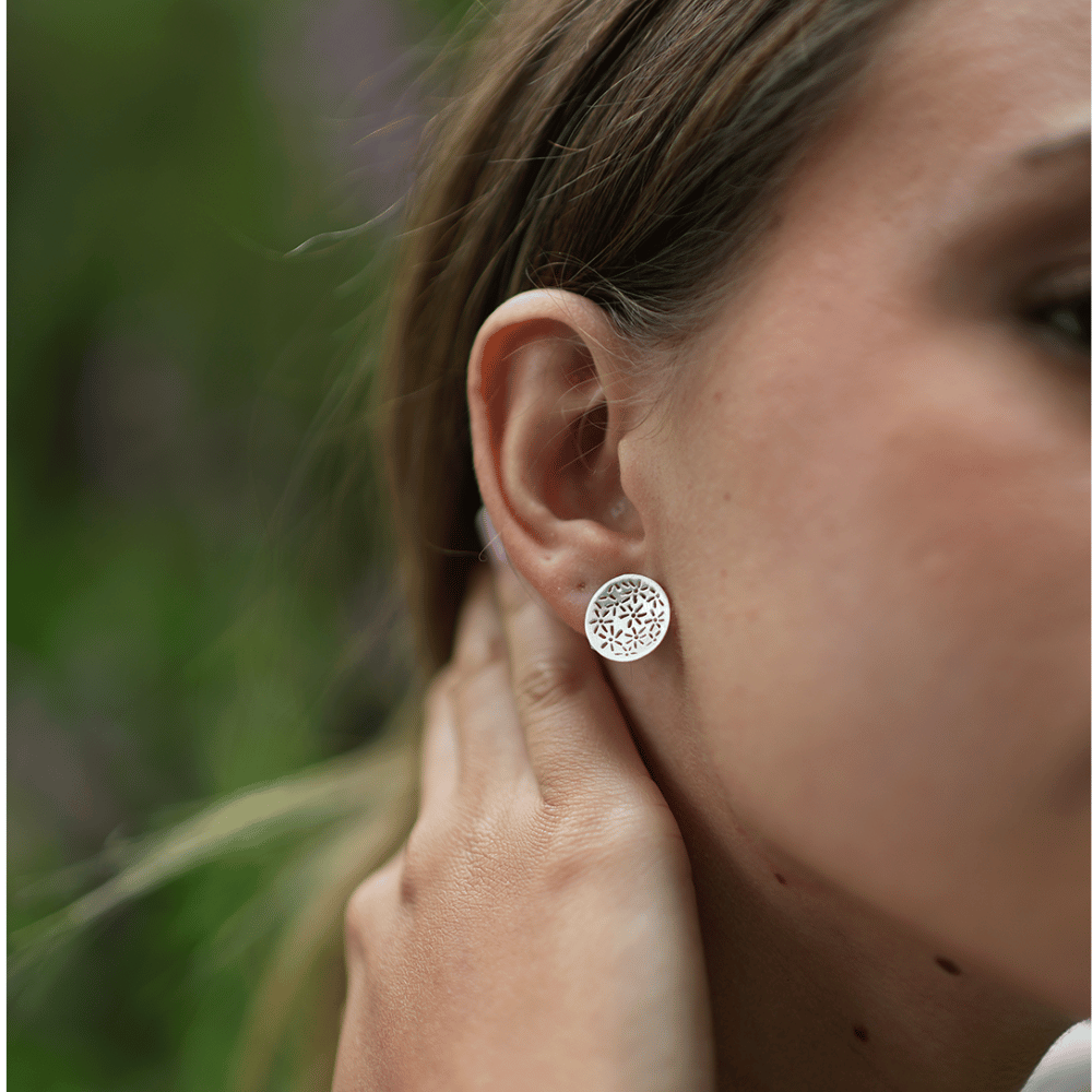 El pendiente Cirlor está elaborado en Plata de Ley con acabado mate, y presenta un diseño circular con dibujo de flores caladas que evoca elegancia y frescura a partes iguales. Su forma plana y ligera lo hace cómodo para el día a día, mientras que su diseño sofisticado lo convierte en un toque especial para cualquier ocasión.