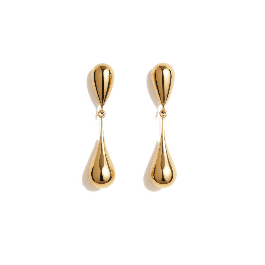• Pendientes elaborados en acero chapado en oro con un elegante diseño de dos gotas unidas, que aporta movimiento y fluidez a la pieza. Su estructura alargada estiliza el rostro y crea un efecto sofisticado y muy femenino.