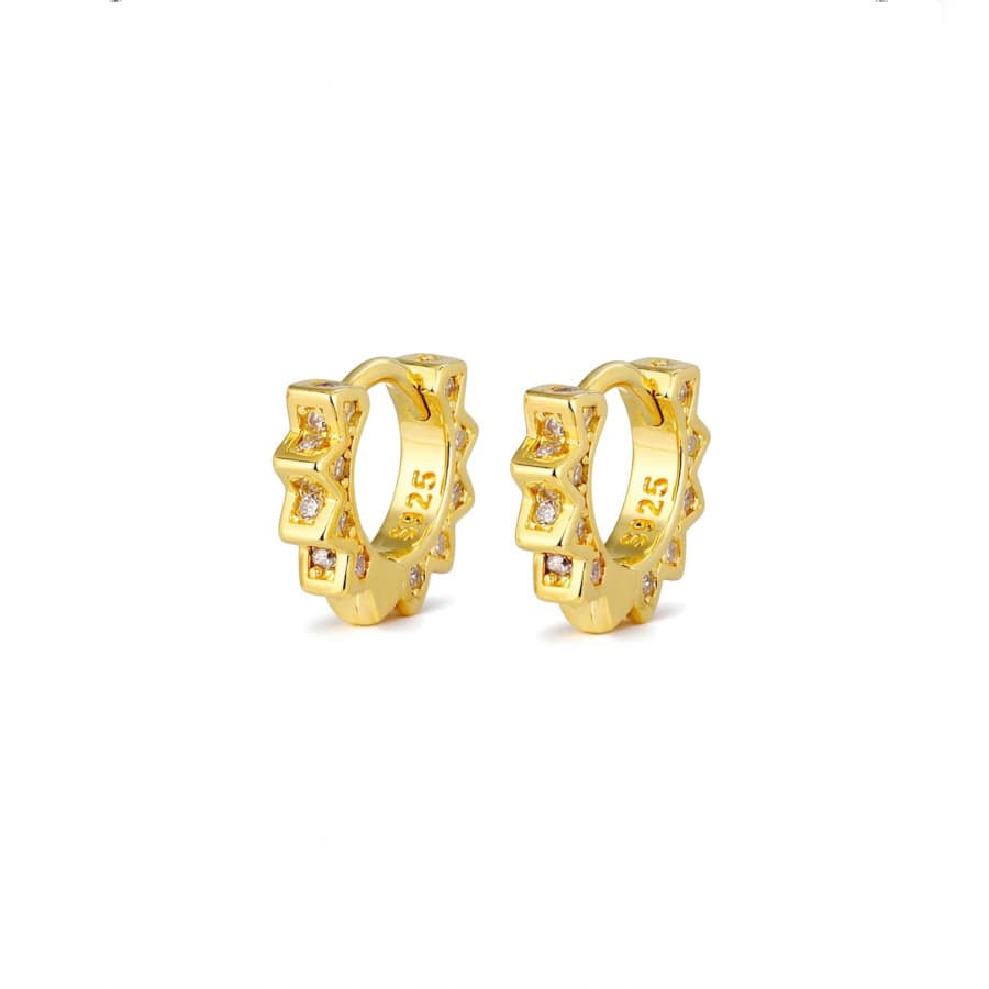 Los pendientes Graje destacan por su diseño original y llamativo: un aro bañado en oro coronado por pequeños picos geométricos, cada uno engastado con circonitas blancas que aportan un brillo sutil y moderno. Su silueta es diferente a lo habitual, ideal para quienes buscan un pendiente pequeño pero con mucha personalidad.
