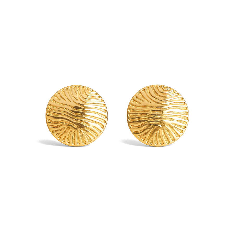 Pendientes elaborados en acero chapado en oro con diseño de círculo texturizado, decorado con formas irregulares y líneas en relieve que crean un efecto dinámico y muy elegante. Su superficie trabajada aporta profundidad y un estilo distintivo.
